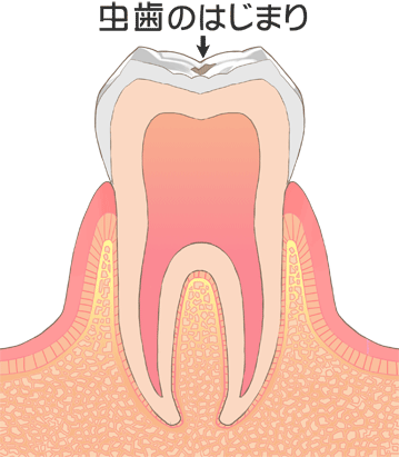 歯の表面のエナメル質が溶けはじめ、黄色っぽくなったり黒ずんだりしてきた状態。冷たいものがしみることがあり、通常、痛みはありません。虫歯になってしまった部分を削り、歯科用プラスチックを詰めて治療します。