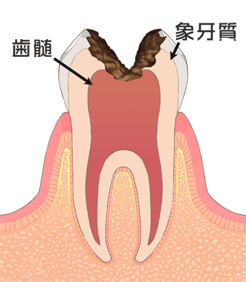 虫歯が神経まで進行した状態です。冷たいものだけでなく熱いものがしみるようになり、何もしていなくてもズキズキと激しく痛むこともあります。感染してしまった神経を除去し、神経が入っていた部分を消毒して薬剤を詰める根管治療を行います。被せ物をする治療になる場合があります。