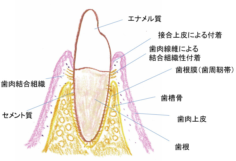 正常歯周組織では歯肉はエナメル質と接合上皮で付着しています。