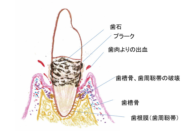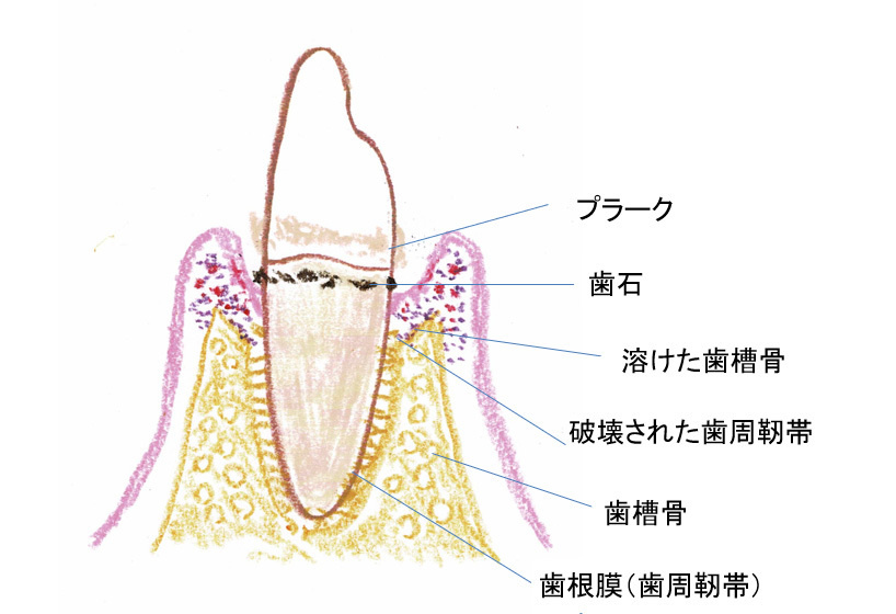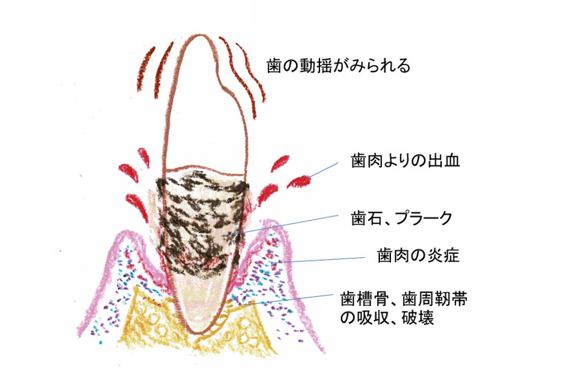 歯肉の炎症に加え、歯を支える歯槽骨、歯周靭帯の破壊が著しくなります。