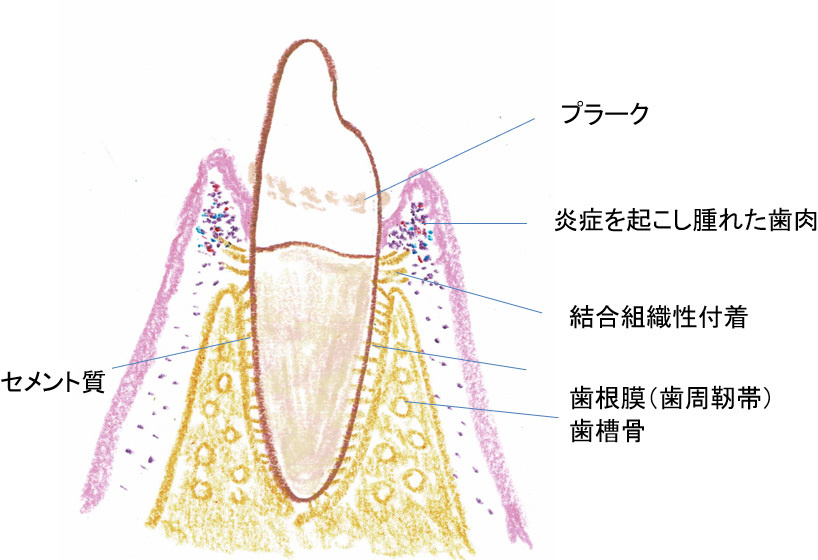 その下に歯根のセメント質と歯肉が結合組織性付着、